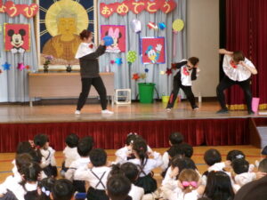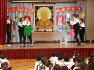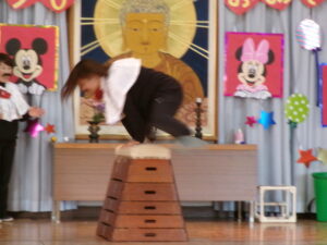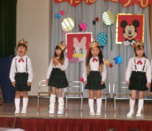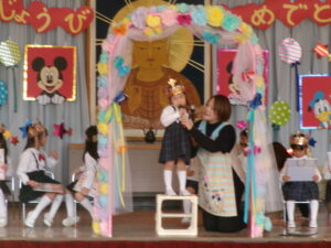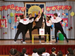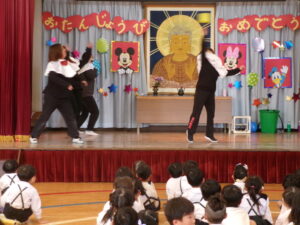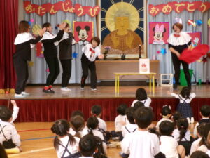 令和7年12月16日(火)12月生まれ誕生日会。大きくなったら何になりたいかを発表したり、歌や遊戯を、披露しました。先生たちのアトラクションは、「ひげダンス」。コミカルなダンスとともに、様々な技が成功すると、歓声があがりました。