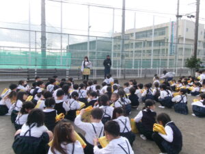 令和8年1月19日(月)「防災訓練」。消防士さんの指導のもと、避難訓練をおこないました。先生の話をきちんと聞いて落ち着いて避難することが出来ました。また、防災服の着用、起震車体験など、貴重な経験ができました。