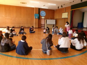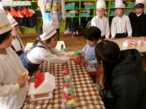 令和8年2月16日(月)すまいるタイム⑩「お買い物ごっこ」。幼稚園のお友だちが、いろいろな品物を手作りして、お店屋さんになってくれました。手作りおサイフに、お買い物券を入れて、お買い物ごっこを楽しみました。買ってきた品物を、嬉しそうに見せてくれました。お買い上げ、ありがとうございました。