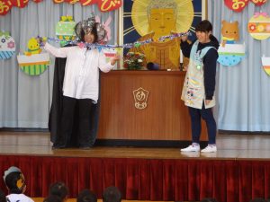 令和7年10月28日(火)10月生まれの誕生日会を行いました。お名前、大きくなったら、なにになりたいかを大きな声で発表してくれました。「シンデレラのスープ」「むしの声」も上手に披露してくれ、その後、先生の「バルーンシアター」を楽しみました。