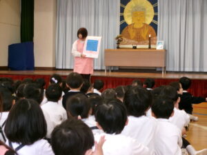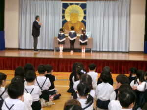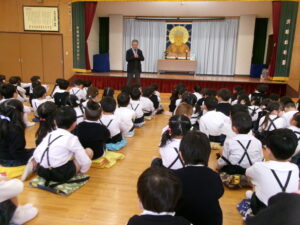 平成30年12月21日(金)2学期終業式 如来様に学期最後の礼拝をしました。園長先生から運動会、光明祭、発表会などの大きな行事に一生懸命取り組りくんだ事や、チャレンジレコードにも多くのお友達がチャレンジしてくれ、王様やスーパーの認定を受けた園児もいて、とても頑張った事のお話がありました。冬休みの過ごし方や、休み中のお約束を子ども達と一緒に確認しました。