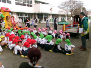 令和7年11月18日(火)避難訓練(火災発生)を行いました。外遊びの中、避難の仕方や「おはしも」のお約束についてお話をしっかりと、聞くことができました。最後に、消火訓練も行いました。