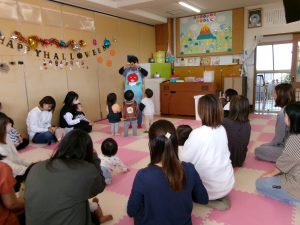 令和7年10月30日(木)「ハロウインごっこ」親子でふれあい遊びを楽しんだ後、パンプキンお化けのバッグを作りました。仮装した先生たちから、お菓子をもらい、ハロウイン気分を味わいました。ふうせんのうたのペープサートもハロウインージョンにして、子ども達も「おばけ」「ネコ」と喜んでくれましt。