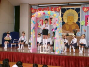 令和5年9月12日(火)8月生まれ誕生会を行いました。15名のお友達が舞台の上でお名前、大きくなったら何に何になりたいかを上手に発表してくれました。先生からは、「3匹のヤギ」のパネルシアターのプレゼントがあり、ドキドキワクワクのお話を観ることを楽しみました。保護者の皆様ご参加ありがとうございました。
